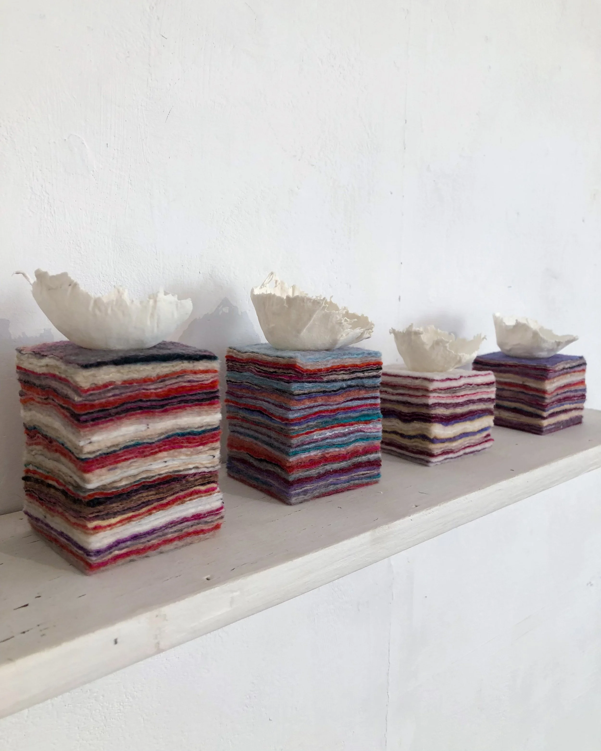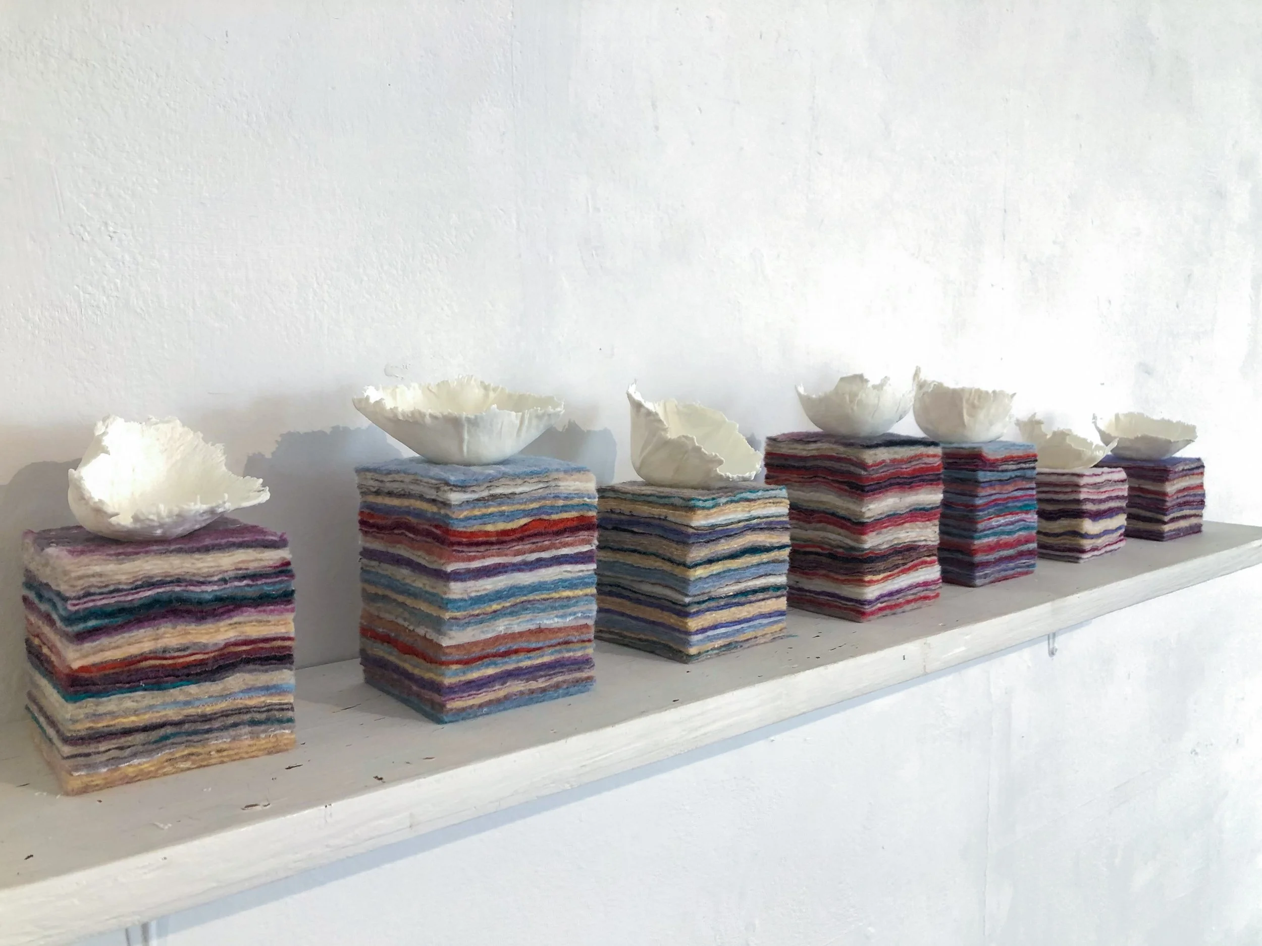 Pressure Point, 2024, layered hand made felt with porcelain bowls made from vintage garment fragments.